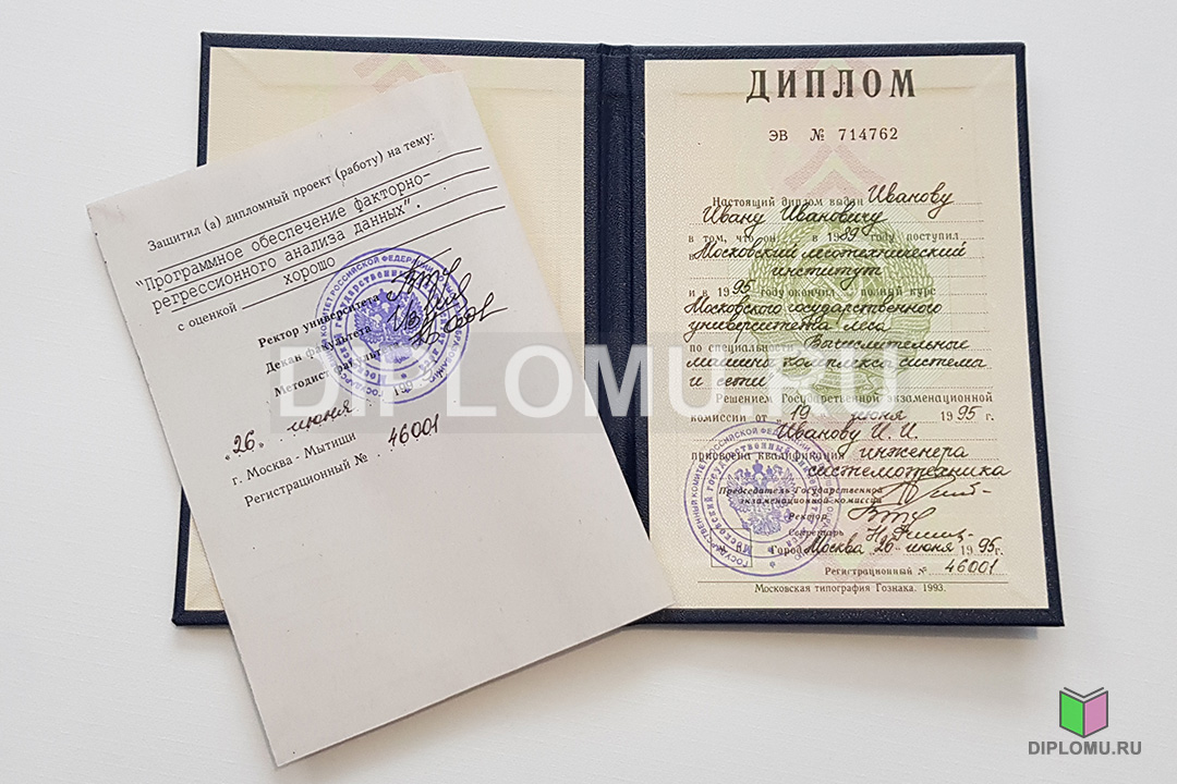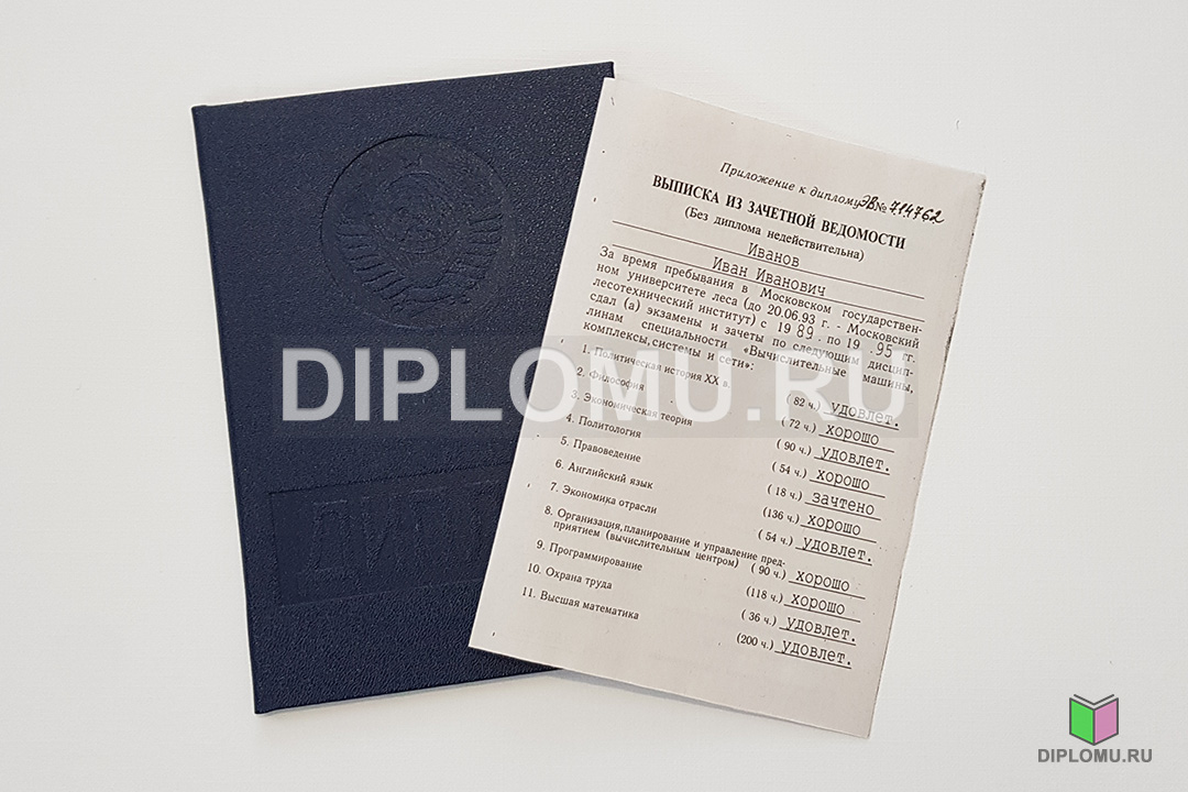На нашем сайте Вы можете купить диплом ВУЗа СССР о высшем образовании с окончанием института или университета в период с 70-x годов и до 1996 года включительно. До 1991-1993 годов старые дипломы заверялись гербовой печатью СССР (РСФСР), а позднее — печатью РФ с двуглавым орлом. Наши специалисты заполнят диплом по всем правилам, установленным на тот период. Заверяются «мокрыми» печатями и нужными подписями.
